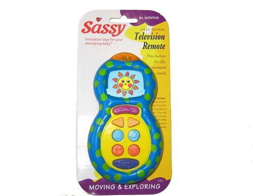 Silly Sounds Television Remote makes funny cartoon-like sounds when the buttons are pressed. It has a prism on top that reflects light and looks just like the infrared light on a real remove. Bright colors, interesting textures, soft sounds and a picture that changes back and forth from a smiling sun to a red racecar provide stimulating entertainment.